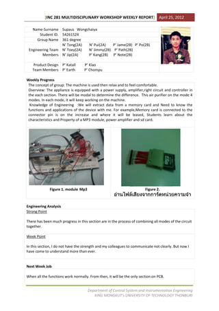 This weekly report from an engineering workshop group describes their progress on developing an air purifier. The group, called 361 degrees, is divided into an engineering team and product design team. This week they have made progress combining all the purifier's modes into a single circuit. Their next steps are to finish the circuit board and ensure all functions work normally. The report includes figures of modules used and notes on engineering knowledge gained about components like the MP3 module, power amplifier, and SD card.