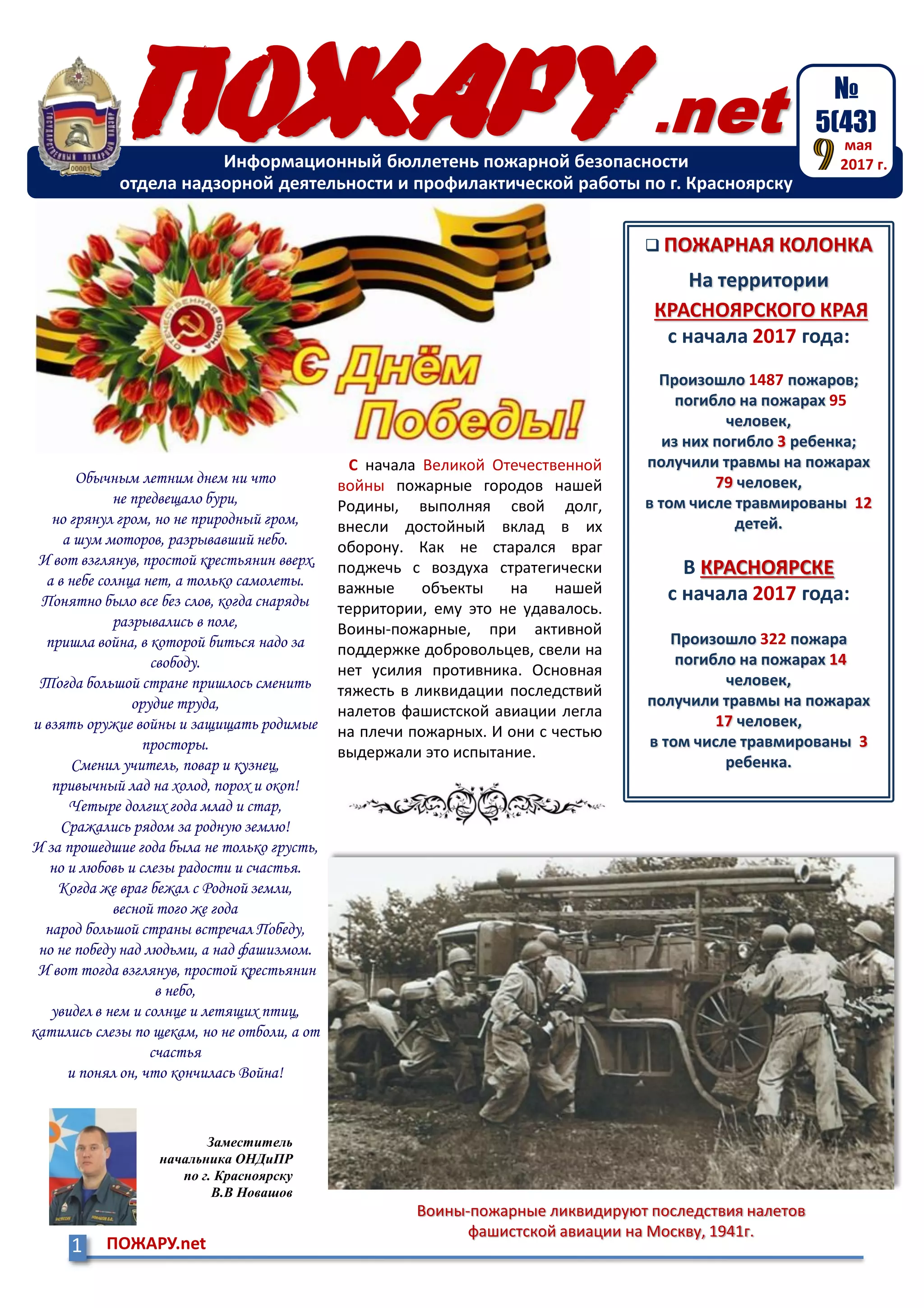 С начала 2017 года в Красноярском крае произошло 1487 пожаров, что привело к 95 смертям, включая 3 детей. Пожары часто возникают из-за неосторожного обращения с огнем, особенно при курении, а также в результате детских шалостей и сжигания сухой травы. В связи с повышенной пожарной опасностью на территории Красноярского края введен особый противопожарный режим с запретом на разведение костров и другие пожароопасные работы.