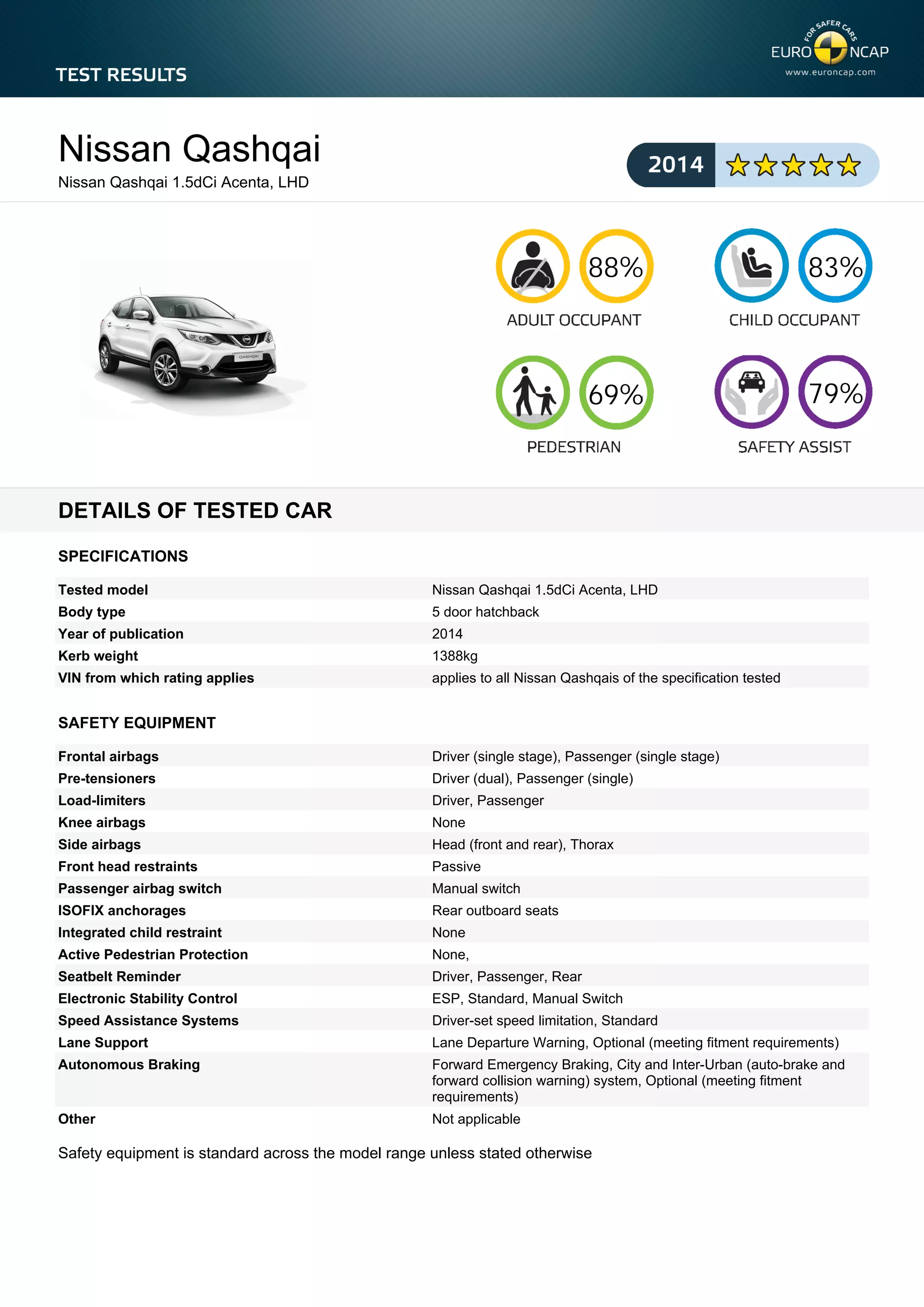 The Nissan Qashqai provided good protection for adult occupants in crashes, with the passenger compartment remaining stable. Child occupants were also well protected, with tests indicating minimized head movement and injuries. While the bumper offered good pedestrian protection in some areas, results were predominantly poor in more outboard locations. Standard safety features included electronic stability control and seatbelt reminders. Optional autonomous emergency braking performed adequately at high speeds but was not assessed for low-speed city driving.