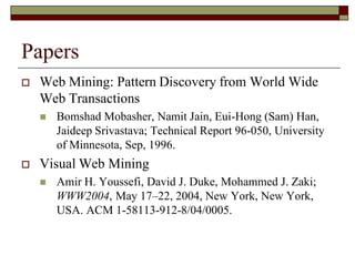 This document discusses different types of web mining techniques. It begins by defining web mining as the application of data mining techniques to discover and extract information from web data. The three main types of web mining are discussed as web content mining, web structure mining, and web usage mining. Web content mining involves mining the actual contents within web pages and documents. Web structure mining mines the hyperlink structure of websites to determine how web pages are linked together. Web usage mining mines web server logs to discover user browsing patterns and behaviors.