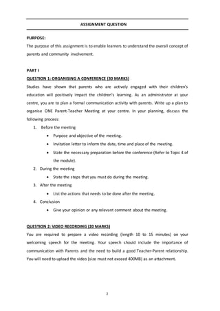 1. Tugasan ini memerlukan pelajar merancang satu perjumpaan ibu bapa-guru dan merakamkan ucapan alu-aluan untuk perjumpaan tersebut.