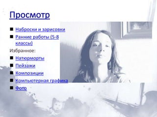 Документ представляет собой коллекцию ранних художественных работ Дарьи Костенко, выпуска 2012 года, включающую натюрморты, пейзажи, композиции и компьютерную графику. В нем собраны наброски и зарисовки, выполненные в 5-8 классах. Также в документе представлены фото ранних работ.