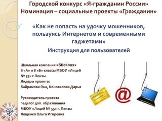 Документ описывает городской конкурс 'Я-гражданин России', фокусируясь на социальных проектах, направленных на предупреждение интернет-мошенничества. Он обобщает основные виды онлайн-мошенничества и результаты исследования среди пользователей интернета, подчеркивая важность профилактической работы и повышенной бдительности. Также приводятся предложения по проведению тренингов для повышения осведомленности о киберугрозах.