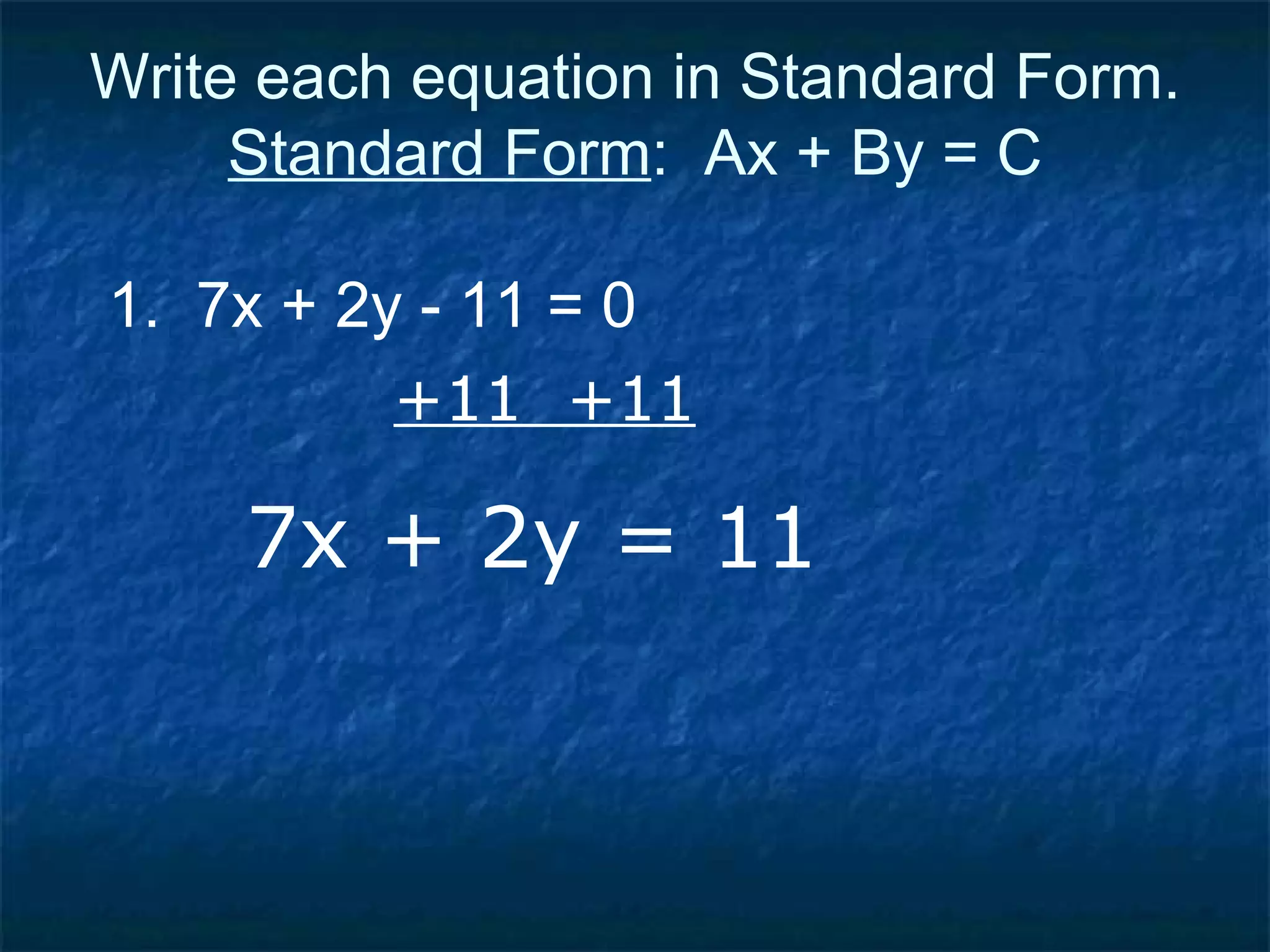 The document provides examples of writing linear equations in standard form (Ax + By = C) and point-slope form (y - y1 = m(x - x1)) by converting between the two forms. It also gives examples of finding the slope and y-intercept of a line from two points to write the equation in point-slope and slope-intercept forms. Finally, it demonstrates finding the x- and y-intercepts of lines from their equations and using them to graph the lines.
