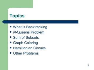 The document discusses various backtracking algorithms and problems. It begins with an overview of backtracking as a general algorithm design technique for problems that involve traversing decision trees and exploring partial solutions. It then provides examples of specific problems that can be solved using backtracking, including the N-Queens problem, map coloring problem, and Hamiltonian circuits problem. It also discusses common terminology and concepts in backtracking algorithms like state space trees, pruning nonpromising nodes, and backtracking when partial solutions are determined to not lead to complete solutions.