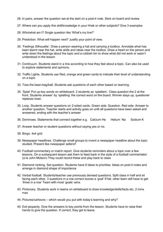 This document lists 55 different consolidation activities that can be used to summarize and review learning at the end of a lesson. The activities include having students list key things they learned, writing summaries, giving feedback to peers, creating diagrams, answering questions, and reflecting on their understanding through discussion or informal assessment methods like traffic light cards. The variety of active learning strategies are intended to solidify understanding of lesson content.