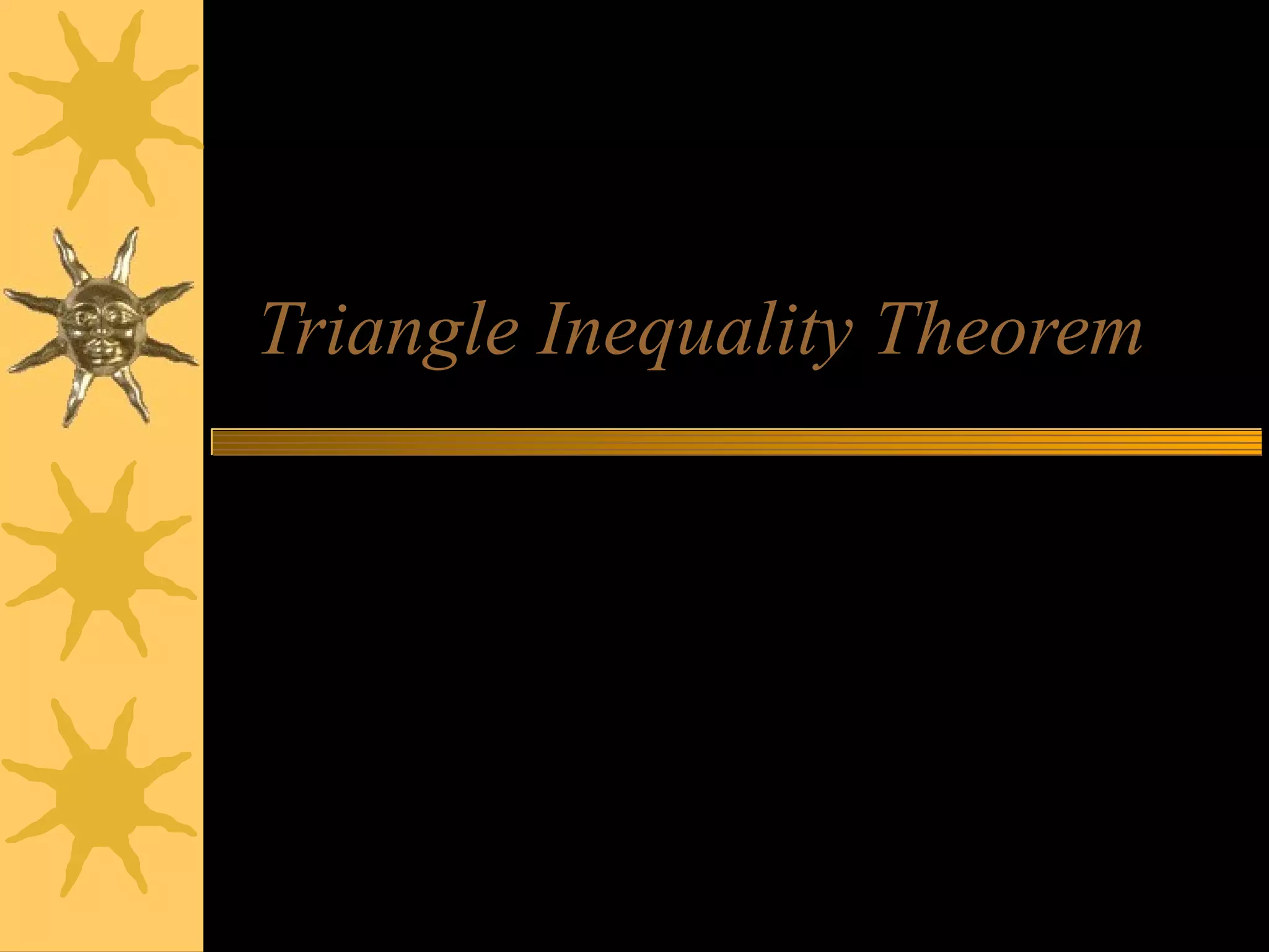 The triangle inequality theorem states that the sum of the lengths of any two sides of a triangle must be greater than the length of the third side. It can be written as inequalities comparing the different side lengths, such as AB + AC > BC. The converse is also true - the side opposite the largest angle will be the longest side. Examples demonstrate using the triangle inequality theorem to determine if a set of lengths could form a triangle or find the possible range of values for the third side of a triangle given two side lengths.