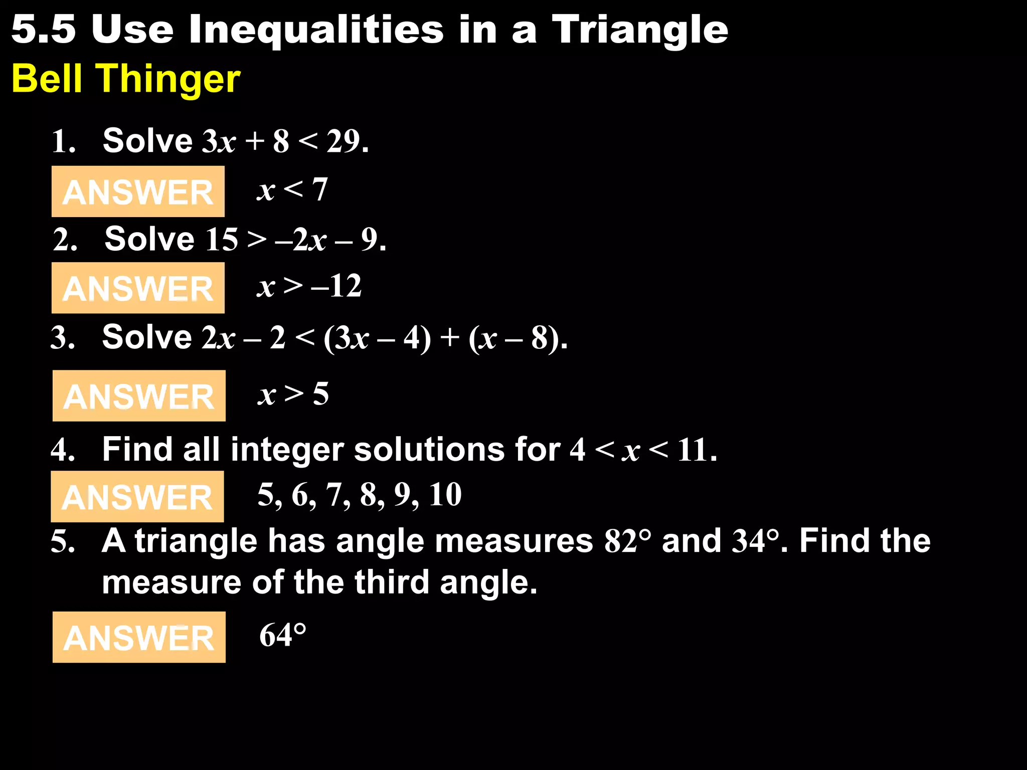 This document provides examples and exercises on using inequalities to solve problems involving triangles. It defines the triangle inequality theorem and shows how to set up and solve inequalities to find possible lengths of triangle sides. Examples demonstrate drawing diagrams to visualize solutions and labeling angles and sides in order of measure. Practice problems have students list triangle sides or angles from least to greatest, determine if given side lengths can form a triangle using inequalities, and find the possible length of a third side of a triangle given the other two sides.
