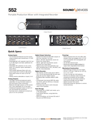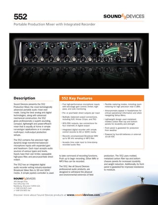 The Sound Devices 552 is a portable production mixer and integrated digital audio recorder that contains five high-quality microphone preamps, integrated digital recording to SD cards, and advanced features for field production. It is designed to be lightweight, durable, and easy to use in run-and-gun applications while also supporting more complex setups. The 552 provides professional audio quality and functionality in a compact and power-efficient portable package.