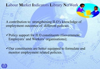 The document discusses the Labour Market Indicators Library Network, which aims to strengthen ILO's knowledge of employment policies by increasing the availability and timeliness of labour market information. The Network piloted indicators in several regions with support from ILO field offices and headquarters. It developed an internet-based database with core indicators and metadata. While the pilot faced challenges like limited internet access, the Network seeks to expand coverage, refine indicators and guidelines, and make the database more user-friendly to better support employment analysis.