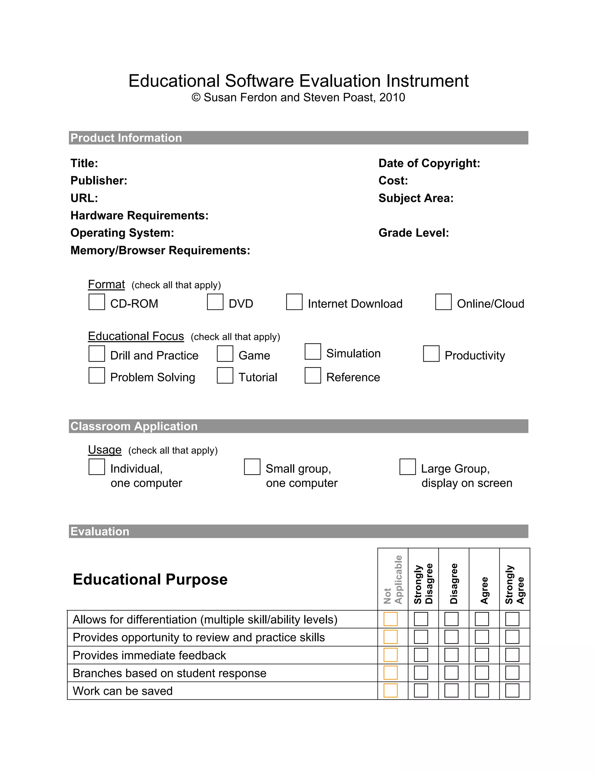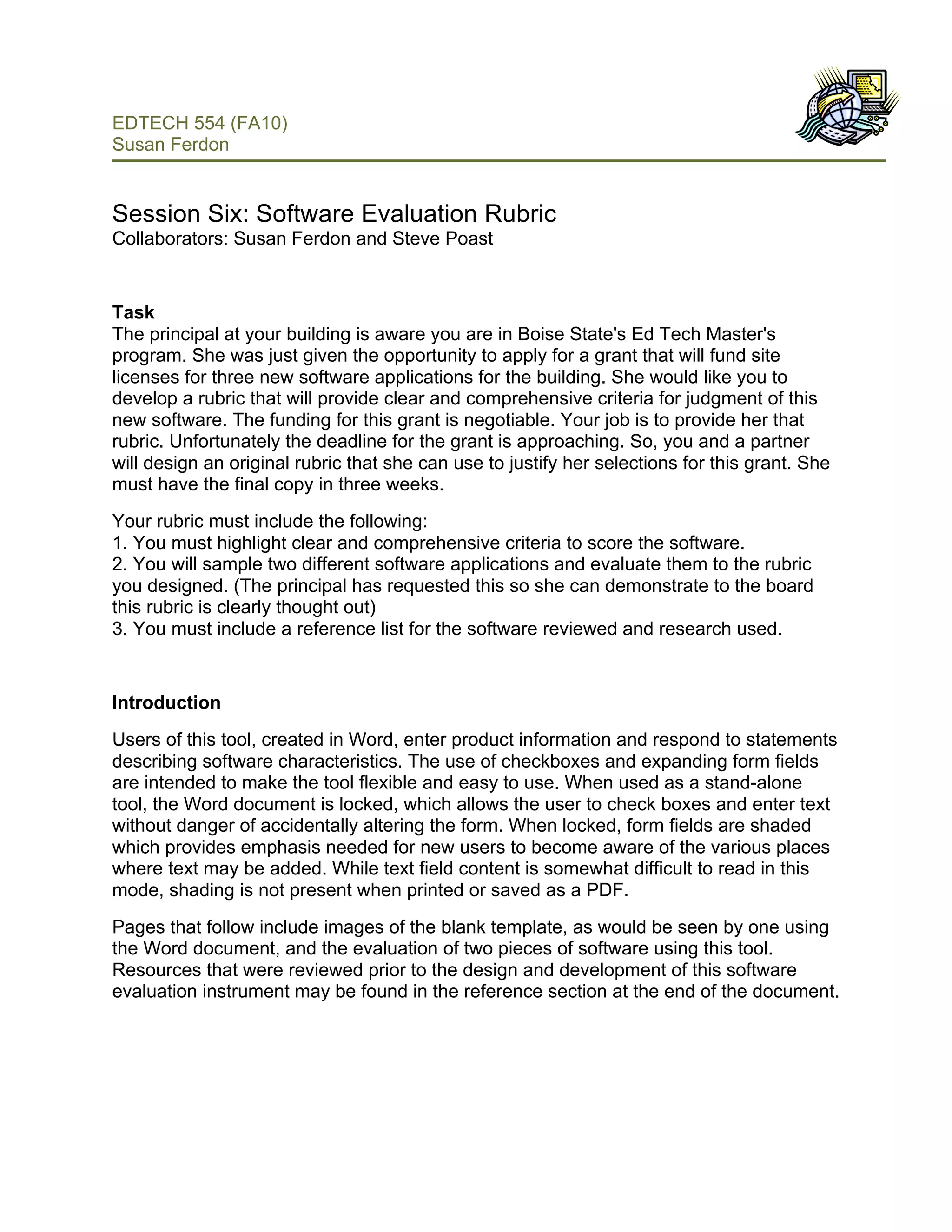 The principal asked the author to develop a rubric to evaluate software for a grant to fund new applications for the school. The rubric must include clear criteria for scoring software, and be used to evaluate two sample applications to demonstrate its usefulness. The author created an educational software evaluation instrument in Word that can be used to enter product information and respond to statements about software characteristics. It includes checkboxes and text fields to flexibly evaluate educational focus, classroom application, educational purpose, subject matter content, progress monitoring, ease of use, presentation, support, and associated costs and services. At the end, the evaluator recommends whether to use the software and includes references.