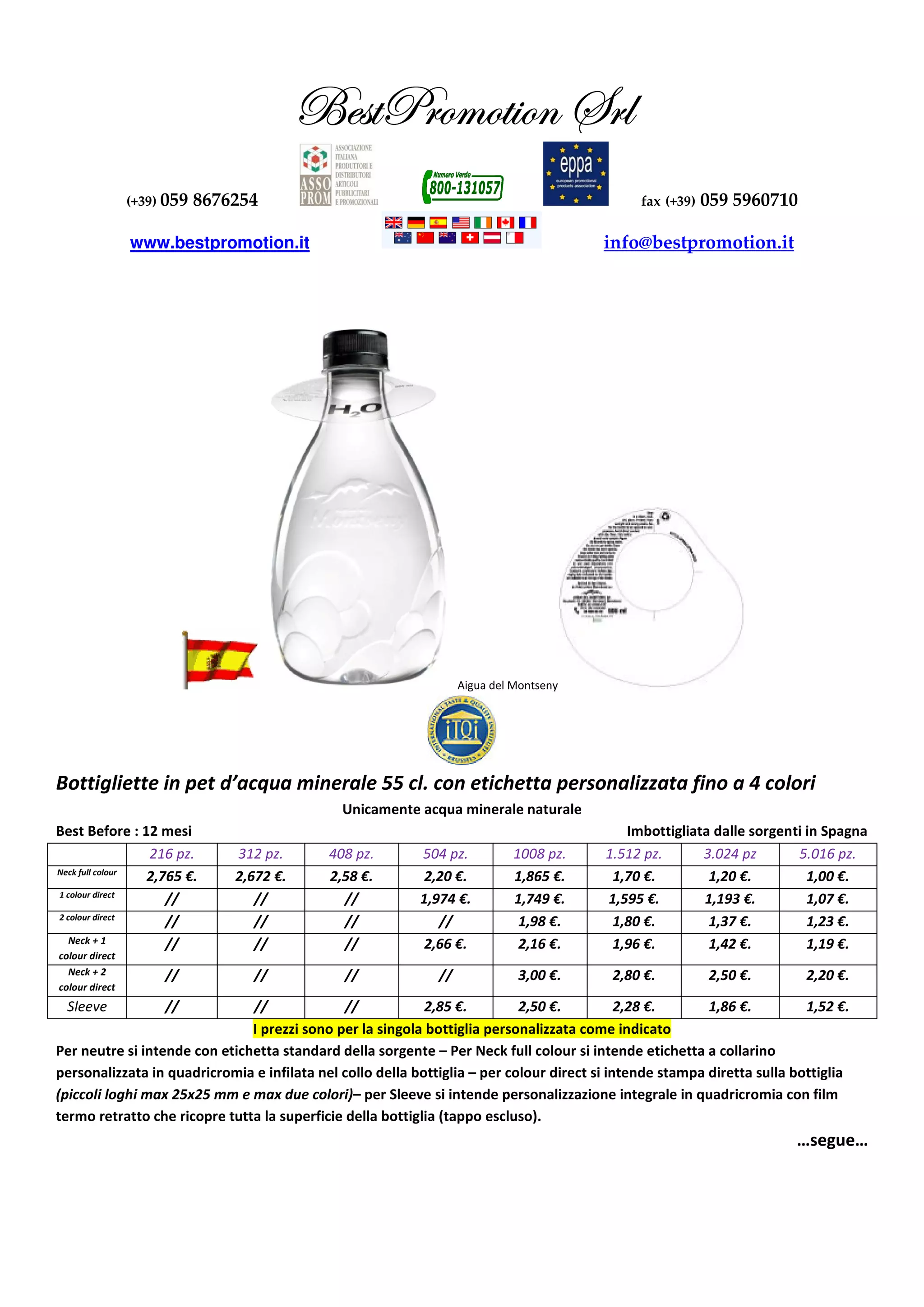 Il documento descrive le bottiglie di acqua minerale da 55 cl con etichetta personalizzata, fornendo informazioni sui prezzi per diverse opzioni di personalizzazione. Le bottiglie sono disponibili in varie quantità e il prezzo è fornito per unità, esclusa l'IVA. Inoltre, viene chiarito il processo di pagamento e le condizioni di consegna, inclusi i costi per la consegna diretta a eventi.