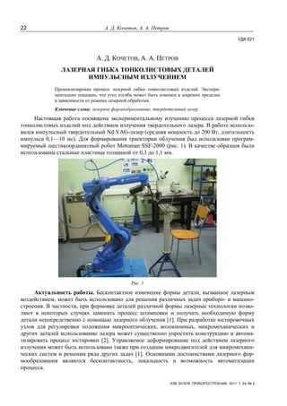 Документ анализирует процесс лазерной гибки тонколистовых деталей с использованием импульсного излучения твердотельного лазера. Экспериментально установлены зависимости угла изгиба от различных параметров лазерной обработки, таких как число проходов и длительность импульса. Результаты подчеркивают значимость толщины пластины и условия обработки для достижения требуемых форм без повреждений.