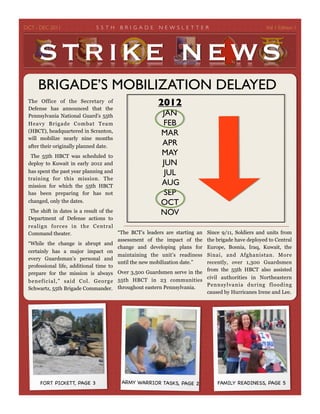 The 55th Heavy Brigade Combat Team's (HBCT) deployment to Kuwait has been delayed by nearly nine months. This change will require additional training to be completed before mobilization. The brigade will focus on Army Warrior Tasks to evaluate soldiers' individual skills in a group environment. Recent training events included sniper competitions and squad battle drills. A new family support group called MentorNet was formed to provide mentoring for military families through experienced senior mentors. Reasons for low family participation in Family Readiness Groups are discussed, along with ways to improve involvement.