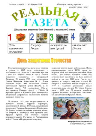 Документ содержит информацию о событиях, связанных с Красной армией и защитой России, а также воспоминания выпускников из школы в селе Каринка о своей школьной жизни и службе в армии. Он описывает подготовку к встрече выпускников и включает работы учащихся, посвященные их родному краю и природе. Также упоминается о значимых людях и событиях, связанных с историей региона и его культурным наследием.