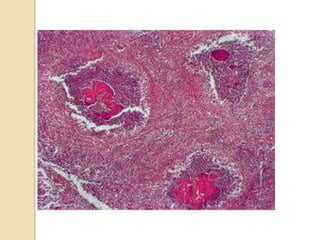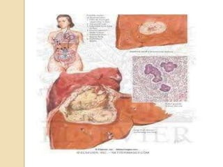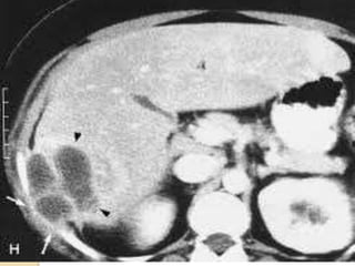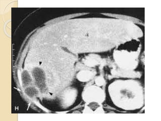 This document summarizes a case study of a 65-year-old female patient who presented with fever, headache, abdominal discomfort and weight loss for 3 months. Imaging revealed multiple liver lesions and biopsy identified the bacteria Actinomyces israelii. The patient was treated with antibiotics and drainage of liver abscesses, leading to complete resolution of symptoms. Actinomycosis is a rare infection caused by Actinomyces bacteria that can form liver abscesses. Diagnosis requires biopsy and culture, while treatment involves prolonged antibiotics and drainage of affected areas.