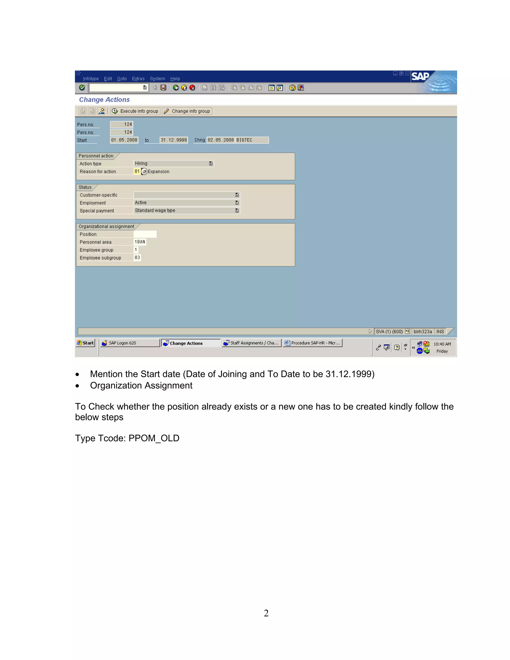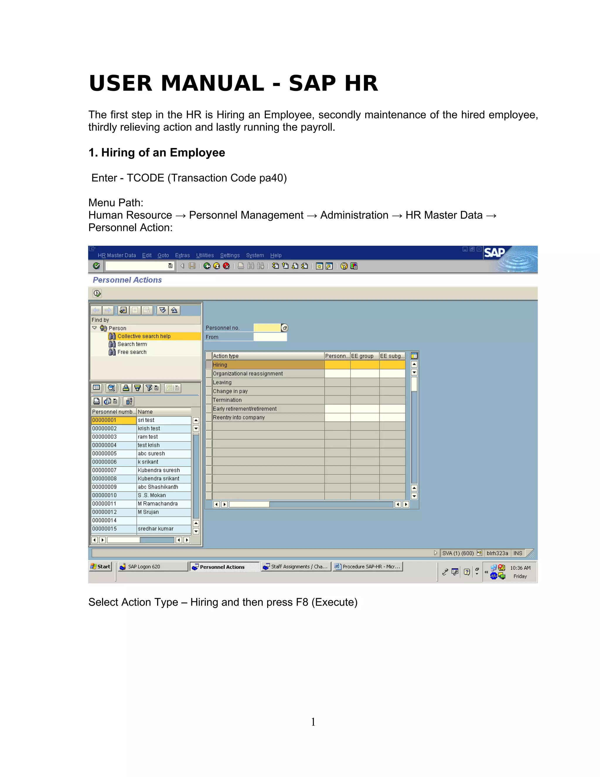 The document provides instructions for key human resources processes in SAP HR, including hiring an employee, maintaining employee data, relieving an employee, and running payroll. The main steps are entering transaction codes to initiate hiring (pa40) and maintenance (pa30) actions, filling mandatory and optional infotype fields, creating organizational assignments, and using transaction code pc00_m40_calc to run payroll for a selected unit. Reports can then be generated using transaction codes like zpayslip and zhr_cashtransfer.