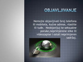 Dokument naglašava važnost zaštite osobnih podataka na internetu, upozoravajući na zabranu objavljivanja brojeva telefona, adresa i neprimjerenog sadržaja. Također se ističe da sama instalacija sigurnosnog softvera nije dovoljna te je potrebna informatička pismenost i svijest o sigurnosnim rizicima. Za održavanje sigurnosti, korisnici trebaju preuzeti odgovornost za svoje uređaje i mreže.