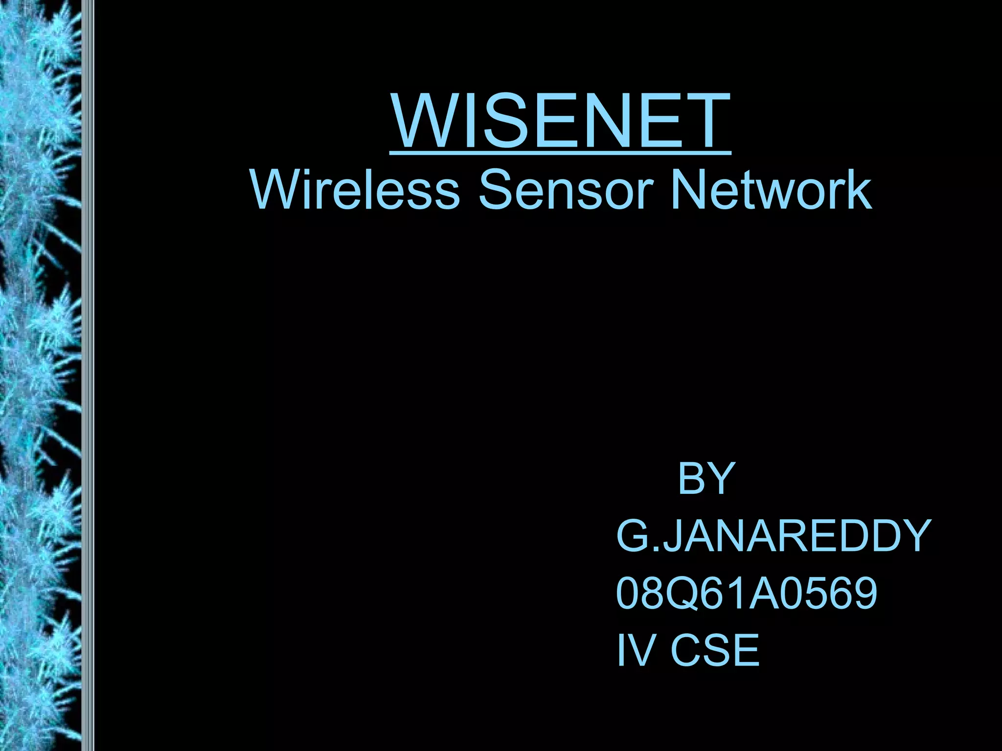 The document describes the Wisenet wireless sensor network project. The project aims to use wireless sensor nodes to monitor environmental factors like temperature and humidity in office buildings. The network uses off-the-shelf components like TinyOS, MySQL database, and PHP web interface. The network architecture includes wireless sensor nodes that form self-organizing networks, a server to collect sensor data and power the web interface, and a standard web browser for users to access reports. The system is currently a prototype but aims to expand the network and further develop the software and applications.