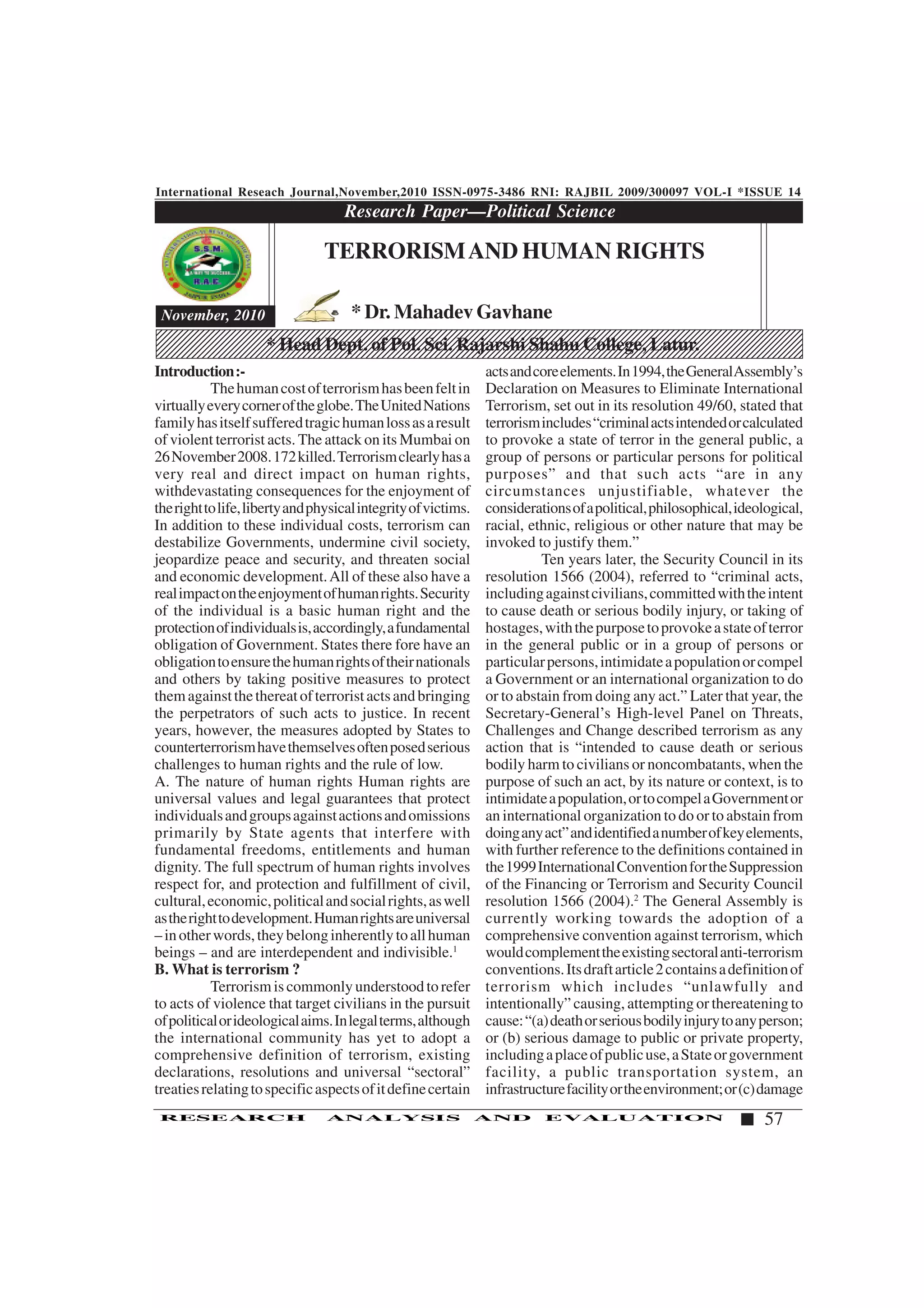 2) It provides definitions of human rights and terrorism from UN resolutions and treaties. Human rights are universal and protect individuals from state interference. Terrorism involves violent acts intended to intimidate civilians for political aims.