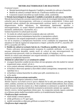 Metoda bacteriologică de diagnostic implică izolarea și cultivarea microorganismelor pentru a obține culturi pure necesare diagnosticării bolilor infecțioase. Mediile de cultură sunt esențiale pentru creșterea bacteriilor și pot fi clasificate în funcție de compoziție, consistență și destinație, având cerințe precise pentru a asigura dezvoltarea optimă a bacteriilor. Caracteristicile culturilor bacteriene sunt influențate de condițiile de mediu, inclusiv temperatura și pH, iar analizele biochimice și antibiogramele sunt importante pentru determinarea patogenității și sensibilității la antibiotice.