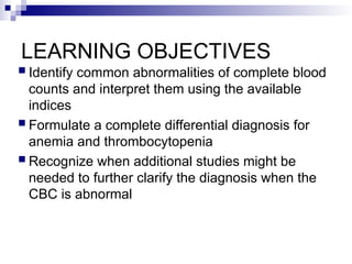 The document discusses pediatric abnormal complete blood counts (CBC) focusing on anemia and thrombocytopenia. It presents case studies to illustrate diagnostic approaches, including required historical information, laboratory evaluations, and management strategies. Key learning objectives include identifying CBC abnormalities, formulating differential diagnoses, and recognizing the need for further studies in abnormal cases.