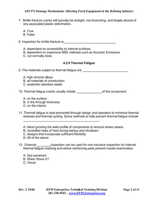 This document provides an overview of various damage mechanisms that can affect fixed equipment in refineries. It discusses types of corrosion, cracking, and other material degradation processes. Some key points covered include temper embrittlement in low alloy steels, brittle fracture risks during startup and shutdown, and methods for preventing issues like thermal fatigue and caustic stress corrosion cracking. A variety of inspection techniques are also outlined for detecting various damage types affecting critical refinery infrastructure.