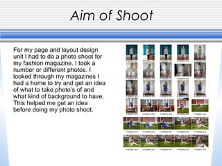 The document summarizes a photography student's process for a fashion magazine photo shoot assignment. The student took photos of 3 outfits with plain and outdoor backgrounds. In editing, they experimented with Photoshop effects to add colors to images until satisfied. The final images came out well and an effect made them look good. Areas for future improvement are noted.