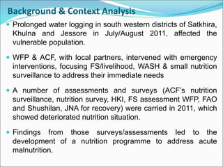 This document summarizes a nutrition program in Bangladesh that aims to address acute malnutrition among vulnerable populations affected by water logging. The program will use a Community-based Management of Acute Malnutrition (CMAM) approach across 18 unions in 4 upazilas. It expects to screen 2,500 children aged 6-59 months, identifying around 600 cases of severe acute malnutrition and 7,400 cases of moderate acute malnutrition. It will also screen 6,300 pregnant and lactating women for moderate acute malnutrition. The program will provide outpatient and inpatient treatment through OTP centers, stabilization centers, and MAM centers. It is being implemented by ACF and WFP through their local partner Shushilan. Progress to date
