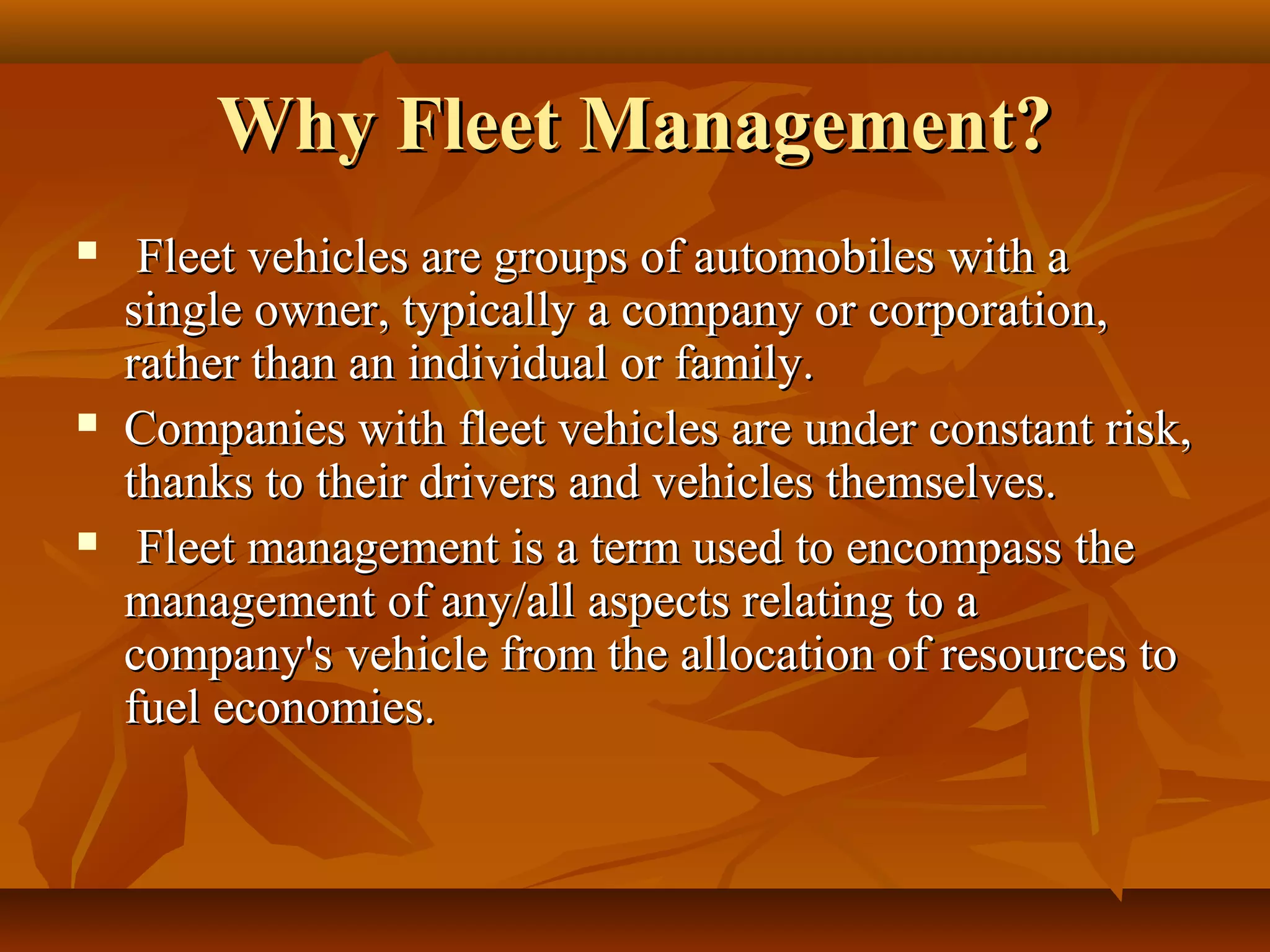 A fleet management system has several key features and components. It allows companies to track their fleet vehicles using GPS or other electronic tracking devices. It can also monitor vehicles' mechanical systems and diagnostics data as well as driver behavior. Fleet management software is used to manage all aspects of a company's vehicles from acquisition to disposal, including tasks, processes, maintenance scheduling, and reporting. An effective fleet management program establishes policies for acquiring, maintaining, replacing and disposing of vehicles in a cost-effective manner. It aims to optimize costs at all stages of a vehicle's lifecycle.