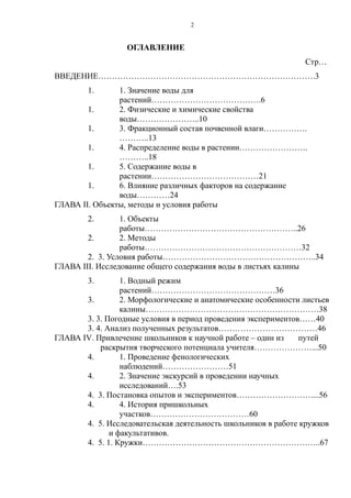 Дипломная работа Наталии Викторовны Филимоновой исследует общее содержание воды в листьях калины в условиях агробиостанции. Работа включает анализ значимости воды для растений, методы исследования и морфологические особенности калины, а также подчеркивает важность использования дикорастущих растений в садоводстве и их лечебные свойства. Привлекли внимание также аспекты научной работы с учащимися и исследования новых сортов культурных растений.