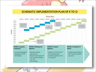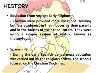 The document provides a detailed history and overview of the Philippine education system from ancient times to the present. It discusses the major periods and reforms, including the Spanish colonial period where education focused on Christian doctrines, the establishment of public education under the American period, and more recent implementations like the K-12 program and universal kindergarten. It also outlines the current structure, including compulsory education levels, tertiary options, and the government agencies that administer education. Finally, it discusses several issues that have arisen, such as inadequate funding, contractualization of teachers, and concerns about cultural sensitivity and specialization within the system.