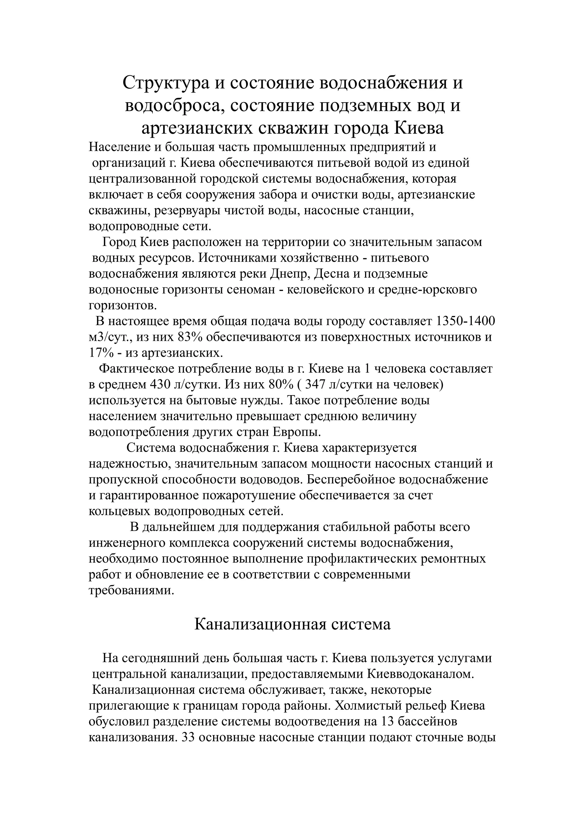 Документ описывает структуру и состояние водоснабжения и водоотведения в Киеве, подчеркивая, что почти все население и предприятия города обеспечиваются питьевой водой из централизованной системы с использованием как поверхностных, так и подземных источников. В настоящее время наблюдается высокая нагрузка на системы, требующая регулярного технического обслуживания и обновления. Кроме того, рассматриваются проблемы загрязнения водоемов и подчеркивается необходимость внедрения эффективных методов очистки сточных вод.