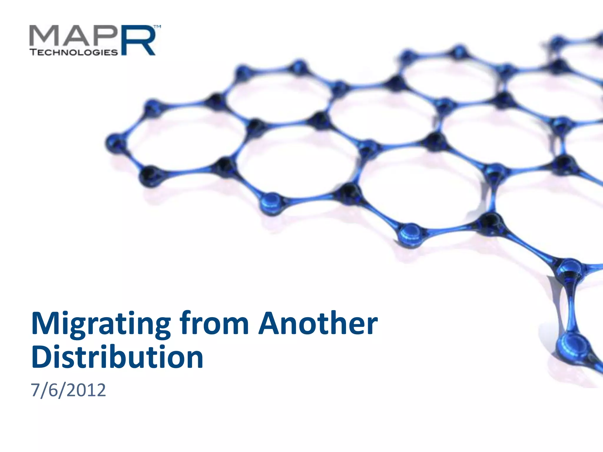 This document outlines the steps for migrating from another Hadoop distribution to MapR, including planning the migration, deploying MapR, migrating components, applications, data, and nodes. The key steps are planning requirements and goals, deploying and testing MapR, migrating customized components to work with MapR, ensuring applications work with MapR filesystem APIs, using distcp or the file client to copy data to MapR, and adding decommissioned nodes from the original cluster to MapR.
