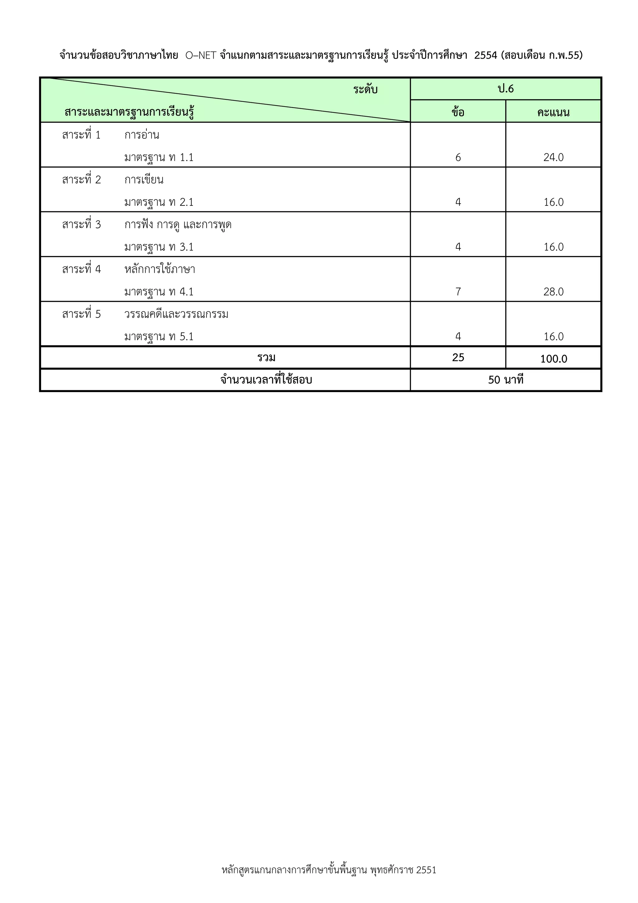 ประจาปีการศึกษา 2554 (สอบเดือน ก.พ.55) ระดับ ป.6 สาระและมาตรฐานการเรียนรู้ ข้อ คะแนน สาระที่ 1 การอ่าน มาตรฐาน ท 1.1 6 24.0 สาระที่ 2 การเขียน มาตรฐาน ท 2.1 4 16.0 สาระที่ 3 การฟัง การดู และการพูด มาตรฐาน ท 3.1 4 16.0 สาระที่ 4 หลักการใช้ภาษา มาตรฐาน ท 4.1 7 28.0 สาระที่ 5 วรรณคดีและวรรณกรรม มาตรฐาน ท 5.1 4 16.0 รวม 25 100.0 จานวนเวลาที่ใช้สอบ 50 นาที หลักสูตรแกนกลางการศึกษาขั้นพืนฐาน พุทธศักราช 2551 ้