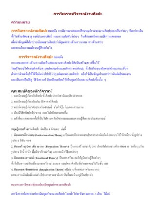 องค์ประกอบศิลป์ และความสัมพันธ์ต่างๆ ในด้านเทคนิคกรรมวิธีการแสดงออก เพื่อนาข้อมูลที่ได้มาประเมินผลงานศิลปะว่ามีคุณค่าทางด้านความงาม ทางด้านสาระ และทางด้านอารมณ์ความรู้สึกอย่างไร การวิจารณ์งานศิลปะ หมายถึง การแสดงออกทางด้านความคิดเห็นต่อผลงานทางศิลปะที่ศิลปินสร้างสรรค์ขึ้นไว้ โดยผู้วิจารณ์ให้ความคิดเห็นตามหลักเกณฑ์และหลักการของศิลปะ ทั้งในด้านสุนทรียศาสตร์และสาระอื่นๆ ด้วยการติชมเพื่อให้ได้ข้อคิดนาไปปรับปรุงพัฒนาผลงานศิลปะ หรือใช้เป็นข้อมูลในการประเมินตัดสินผลงาน และเป็นการฝึกวิธีดู วิธีวิเคราะห์ คิดเปรียบเทียบให้เห็นคุณค่าในผลงานศิลปะชิ้นนั้น ๆ คุณสมบ ัติของนักวิจารณ์ 1. ควรมีความรู้เกี่ยวกับศิลปะทั้งศิลปะประจาชาติและศิลปะสากล 2. ควรมีความรู้เกี่ยวกับประวัติศาสตร์ศิลปะ 3. ควรมีความรู้เกี่ยวกับสุนทรียศาสตร์ ช่วยให้รู้แง่มุมของความงาม 4. ต้องมีวิสัยทัศน์กว้างขวาง และไม่คล้อยตามคนอื่น 5. กล้าที่จะแสดงออกทั้งที่เป็นไปตามหลักวิชาการและตามความรู้สึกและประสบการณ์ ทฤษฎีการสร้างงานศิลปะ จัดเป็น 4ลักษณะ ดังนี้ 1. นิยมการเลียนแบบ (Imitationalism Theory) เป็นการเห็นความงามในธรรมชาติแล้วเลียนแบบไว้ให้เหมือนทั้งรูปร่าง รูปทรง สีสัน ฯลฯ 2. นิยมสร้างรูปทรงที่สวยงาม (Formalism Theory) เป็นการสร้างสรรค์รูปทรงใหม่ให้สวยงามด้วยทัศนธาตุ (เส้น รูปร่าง รูปทรง สี น้าหนัก พื้นผิว บริเวณว่าง) และเทคนิควิธีการต่างๆ 3. นิยมแสดงอารมณ์ (Emotional Theory) เป็นการสร้างงานให้ดูมีความรู้สึกต่างๆ ทั้งที่เป็นอารมณ์อันเนื่องมาจากเรื่องราวและอารมณ์ของศิลปินที่ถ่ายทอดลงไปในชิ้นงาน 4. นิยมแสดงจินตนาการ (Imagination Theory) เป็นงานที่แสดงภาพจินตนาการ แสดงความคิดฝันที่แตกต่างไปจากธรรมชาติและสิ่งที่พบเห็นอยู่เป็นประจา แนวทางการวิเคราะห์และประเมินคุณค่าของงานศิลปะ การวิเคราะห์และการประเมินคุณค่าของงานศิลปะโดยทั่วไปจะพิจารณาจาก 3 ด้าน ได้แก่