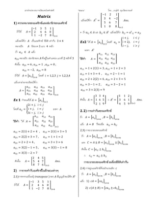 คุณวัฒนานนท ถาให = −1 2 1 3 4 −2 5 6 7 1 0 8 × แลวจะไดวา เปนเมตริกซ มีมิติ เทากับ 3 × 4 หมายถึง มีขนาด 3 แถว 4 หลัก ถา ∈ แลว หมายถึง สมาชิกของ ที่อยูในตําแหนง แถวที่ 2 หลักที่ 3 ดังนั้น = 6 , = 1 , = 0 , = −2, = 8 ถาให = × โดยที่ = 1,2,3 = 1,2,3,4 แลวเราสามารถเขียนไดวา = × กําหนดให = 3×3 โดยที่ = 2 + , < + , = 3 − , > จงหา ให = 11 21 31 12 22 32 13 23 33 3×3 = 2(1) + 2 = 4 , = 2(1) + 3 = 5 = 2(2) + 3 = 7 , = 1 + 1 = 2 = 2 + 2 = 4 , = 3 + 3 = 6 = 3(2) − 1 = 5 , = 3(3) − 1 = 8 = 3(3) − 2 = 7 ดังนั้น = 2 5 8 4 4 7 5 7 6 × . 2.1)การทรานสโพส( ) ของ สัญญลักษณคือ ถาให = −1 2 1 3 4 −2 5 6 7 1 0 8 × แลวจะไดวา = −1 2 1 3 4 −2 5 6 7 1 0 8 4×3 . ∗ ถา ∈ แล ∈ แลวจะไดวา = = ให = 3×3 โดยที่ = + , < + 2 , = − , > จงหา = 11 21 31 12 22 32 13 23 33 = 1 + 2(1) = 3 , = 1 + 2 = 3 = 1 + 3 = 4 , = 2 − 1 = 1 = 2 + 2(2) = 6 , = 2 + 3 = 5 = 3 − 1 = 2 , = 3 − 2 = 1 = 3 + 2(3) = 9 ดังนั้น = 3 1 2 3 6 1 4 5 9 ∴ = 3 3 4 1 6 5 2 1 9 3×3 . ถา = × , = × แลว = ก็ตอเมื่อ = 2.3) การบวกลบของเมตริกซ ถา = × , = × และ = ± = × ± × ดังนั้น = ± × ∴ = ± 2.4) การคูณเมตริกซดวยจํานวนจริง ถา = × , = × แลว 1) = × 2) ( ± ) = ± ×