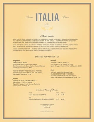 The document details a special culinary event at Campiello for August 2011, highlighting the Venetian cuisine and its historical significance as a trading port. It lists various dishes available, including beef carpaccio, speck-wrapped trout, and squid-ink spaghetti, along with their prices. Additionally, the menu features selected wines to complement the dining experience.