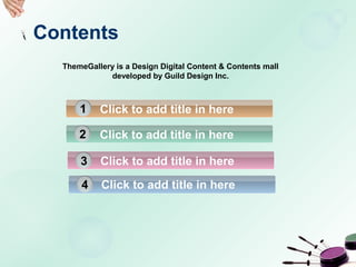 1. The document is a template for a presentation created by ThemeGallery, a digital content marketplace developed by Guild Design Inc.