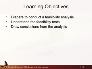 This chapter discusses conducting a feasibility analysis for a new business concept. It covers preparing for the analysis by drafting an initial business description and examining the industry. The analysis involves assessing the business concept, industry and market, product or service, and founding team. Financial needs are also evaluated, including startup costs, working capital requirements, and break-even point. The chapter provides examples of areas and questions to consider in each part of the analysis and outlines a format for a written feasibility report.