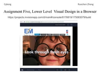 This document discusses assignment five for lower level visual design in a browser. It was created by Cyborg Ruochen Zhang and contains links to invisionapp projects for designing an all posts list that preloads content as well as a design console build. The projects focus on lower level visual design within a browser.