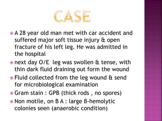 A man was admitted to the hospital with a major soft tissue injury and open leg fracture from a car accident. His leg wound drained a thin, dark fluid. Microbiological examination of the fluid found gram-positive thick rods without spores on gram stain (Clostridium perfringens). C. perfringens is a pathogenic, spore-forming, anaerobic bacterium that can cause gas gangrene, food poisoning, and necrotizing enteritis by producing various toxins. It is commonly found in the intestines but can cause disease when introduced into deep tissue wounds.