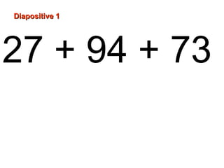 The document provides the solutions to 5 math problems involving addition, subtraction, and multiplication. Each problem is presented on its own slide, and the solutions are provided at the end. The problems include 27 + 94 + 73, 20 - 13 + 3, 2.5 x 3.7 x 4, 30 + 7 x 4, and 6 x 7 + 5 x 4, with the corresponding solutions being 194, 10, 37, 58, and 62.