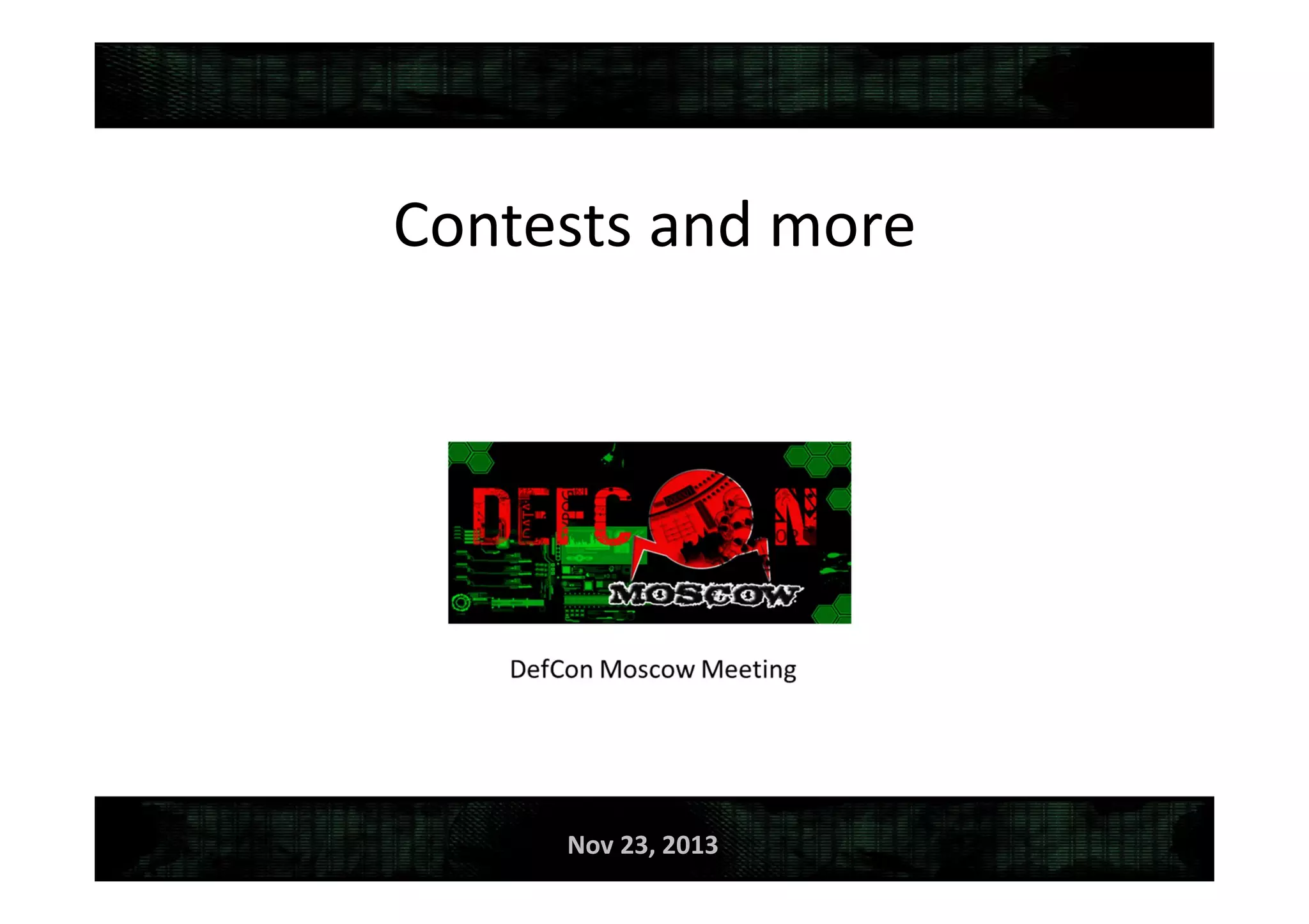 The document announces several security contests including an XSS contest, a contest involving manipulating the location hash and location URL, and a CTF hosted at a website. It also mentions upcoming contests could involve categories like web, crypto, and exploitation challenges. Contact details are provided for more information.