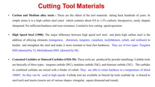 3. Cemented carbides or sintered carbides developed in 1926-1930, which are produced using powder metallurgy and provide high hardness up to 1000°C, allowing high speed machining.