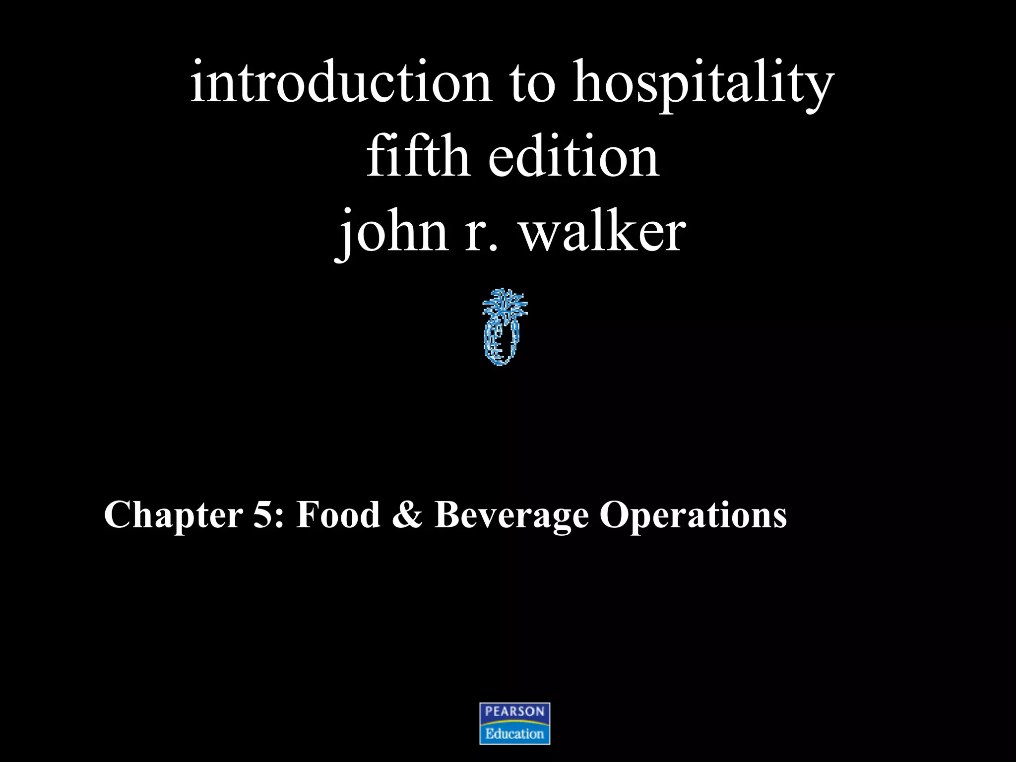 This chapter discusses food and beverage operations in hotels. It covers the organization and responsibilities of various departments like the kitchen, restaurants, bars, catering, room service and more. Trends in the industry include using branded restaurants instead of hotel-run outlets and making menus more casual and standardized. The chapter provides organizational charts and describes the roles of positions like the executive chef, bar manager, catering director and others in ensuring efficient and profitable food and beverage services.
