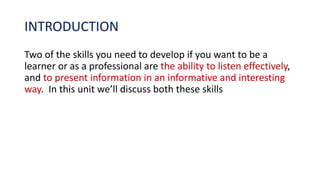 This document provides guidance on effective listening and oral presentations. It discusses the difference between listening and hearing, with listening requiring focusing on and understanding a sound. Tips for listening effectively include deciding what information is needed, paying attention to introductions, taking notes, and avoiding distractions. When presenting orally, one should thoroughly prepare, speak about a familiar topic, focus on the audience, and practice relaxation techniques. An effective presentation includes an introduction to introduce yourself and outline your topic, a body to expand on your points, and a conclusion to summarize main ideas. Proper delivery involves preparation, appropriate attire, eye contact, body language, vocal variety, and avoiding filler words.