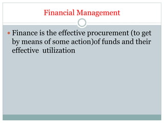 The document provides an overview of financial management, emphasizing the importance of effective fund procurement and utilization within an organization. It outlines the objectives, functions, types of capital, sources of raising capital, budgeting, accounts, and taxation, with detailed explanations on fixed and working capital, various external funding sources, and types of taxes. Additionally, it includes definitions and examples of financial statements, budget types, and the distinctions between different tax categories.