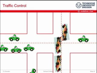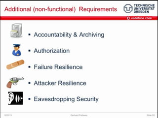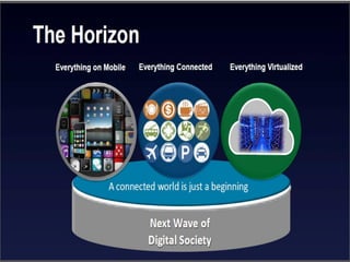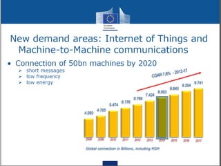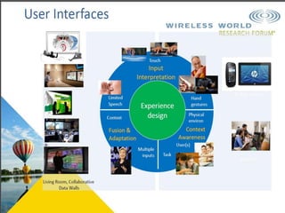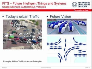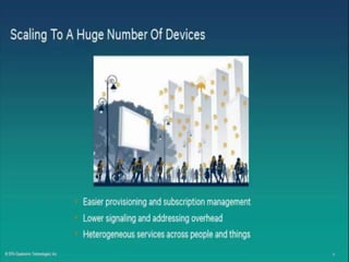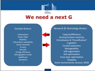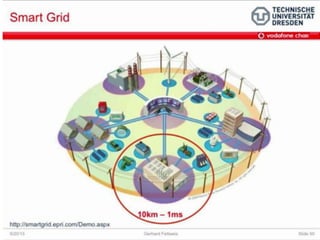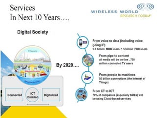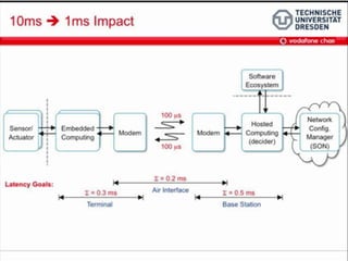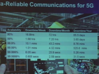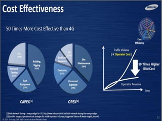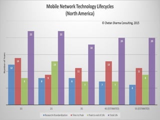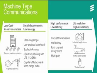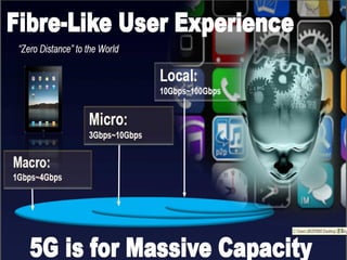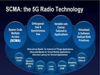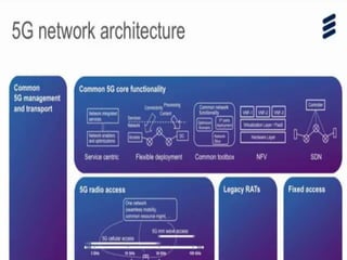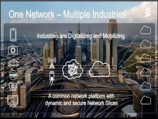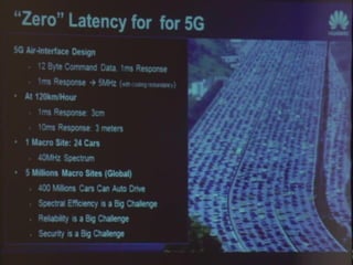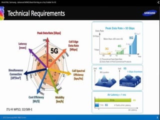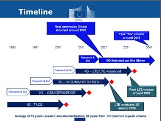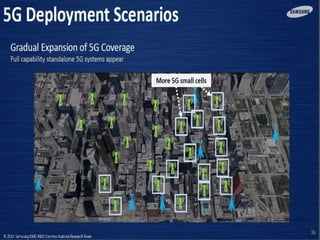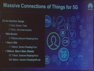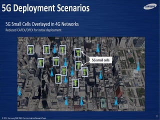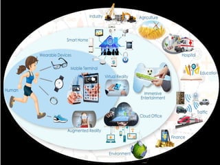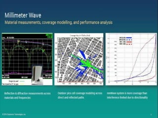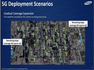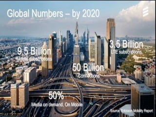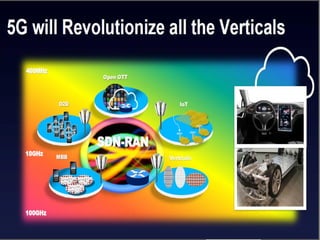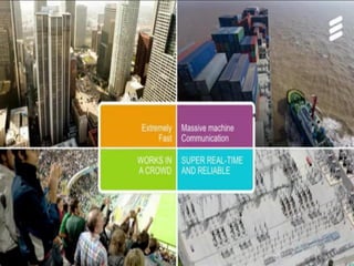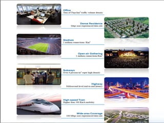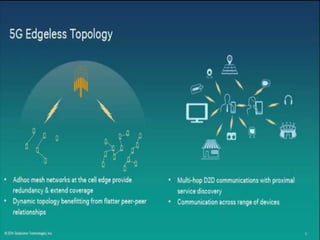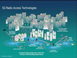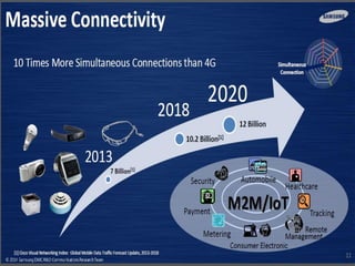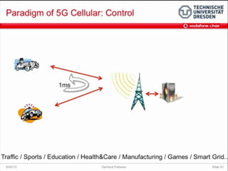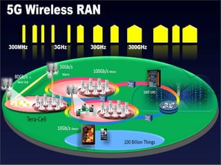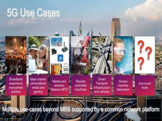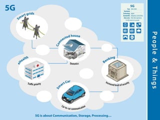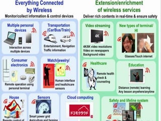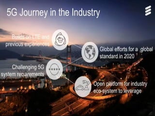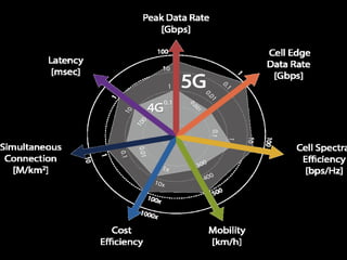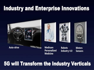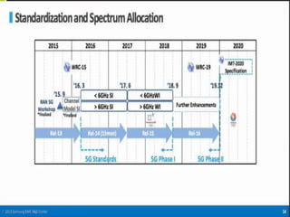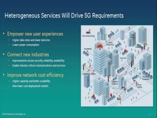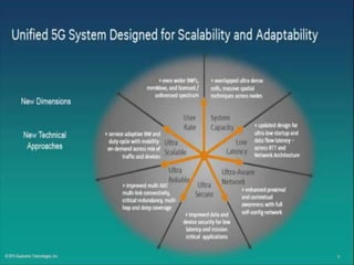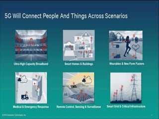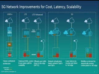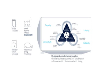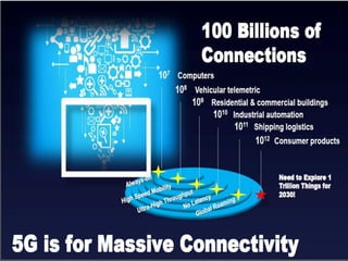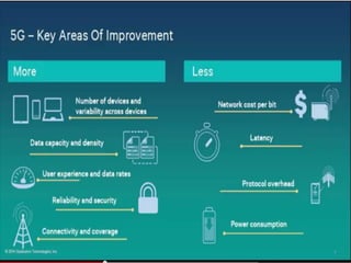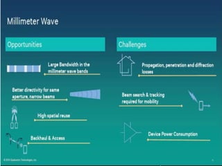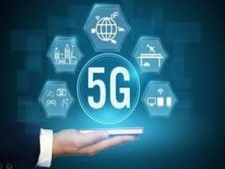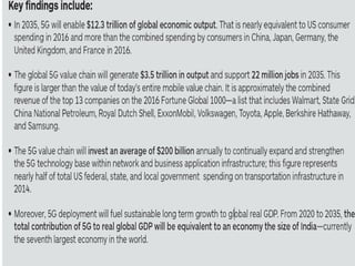 The document discusses the economic impact and benefits of 5G technology. It estimates that 5G will boost the U.S. GDP by $500 billion and create 3 million new jobs. Additionally, 5G solutions applied to vehicle traffic and electrical grids could produce $160 billion in benefits and savings for local communities. The major challenges of 5G include developing the necessary hardware and software to enable speeds over 1 Gbps and connecting billions of devices globally with low latency.
