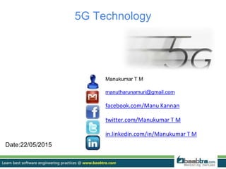 The document provides information on the 5 generations of cellular network technology: 1G through 5G. 1G began in the 1980s and allowed analog voice calls. 2G launched in the late 1980s and added digital voice and SMS. 3G started in the late 1990s and enabled higher speed data up to 2Mbps. 4G launched in 2010 with speeds up to 100Mbps. 5G is the next major phase, expected to have speeds up to 1Gbps, be 10 times more capable than previous generations, and allow for complete wireless communication with almost no limitations.